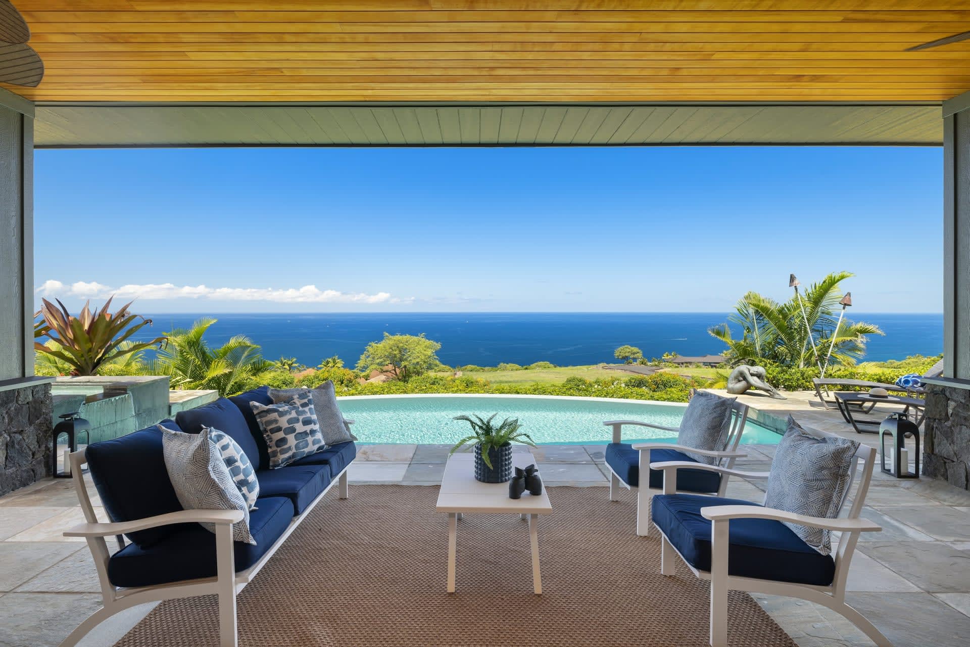 The interior sprawls over an impressive 3,940 square feet effortlessly merging 1,259 square feet of covered lanai, offering an impeccable setting to unwind while immersing yourself in the panoramic expanse. The sprawling lawn extends an open invitation for diverse outdoor recreations, rendering it a true haven for relaxation and leisure. This home is the very essence of refined, Hawaii-style living.