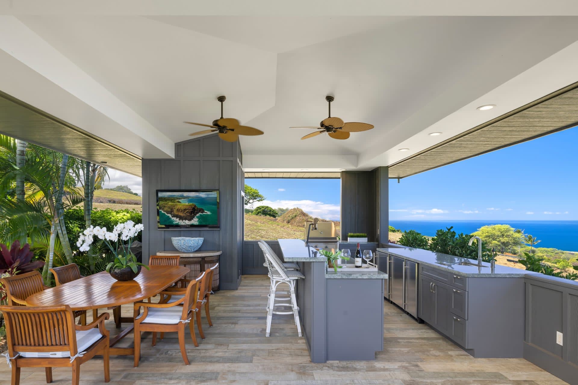 Indulge in the art of outdoor living with a detached pool house that features an outdoor cooking area, perfect for hosting gatherings and enjoying the island’s exquisite culinary offerings. Pocket sliding doors seamlessly transition between indoor and outdoor living, revealing a panoramic view. Effortlessly disappearing, the discrete pocket doors expand the living area into an expansive covered lanai.